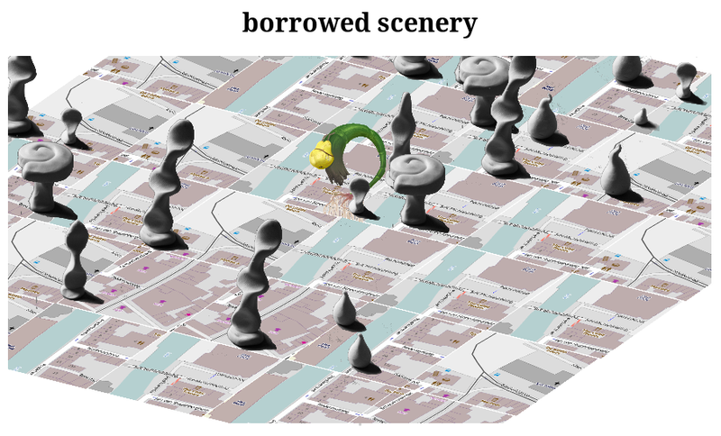 More work on the Borrowed Scenery project and a first screenshot, experimenting with different visual styles. I'm trying modelling clay to get a 3D look on the fungi and using Theun Karelse's mockup characters for player avatars. The floor is being built out of map tiles of Ghent pulled from OpenStreetMap, using the OpenLayers API which has been pretty fast to get running.