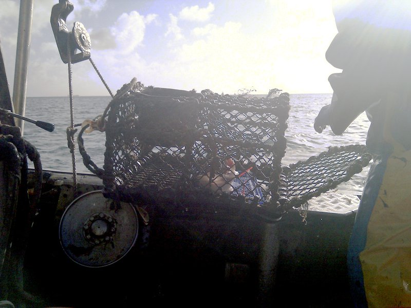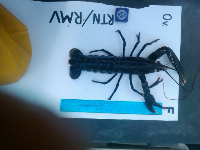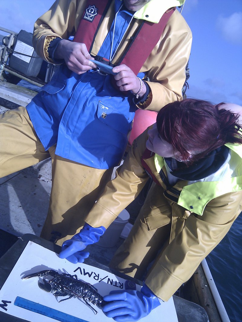 By going out on the boats they get accurate GPS positioning in order to determine detailed population structures, and can sample lobsters that are small or pregnant and need to be returned to the sea as well as the ones the fishermen take back to shore to be sold. Each photograph consists of a cunning visual information system of positioning objects to indicate sex, whether they are for return or removal and a ruler for scale.