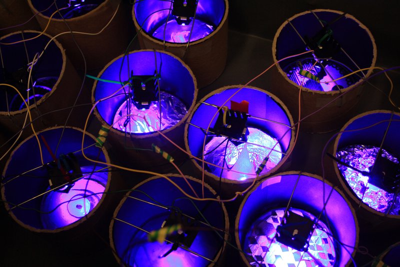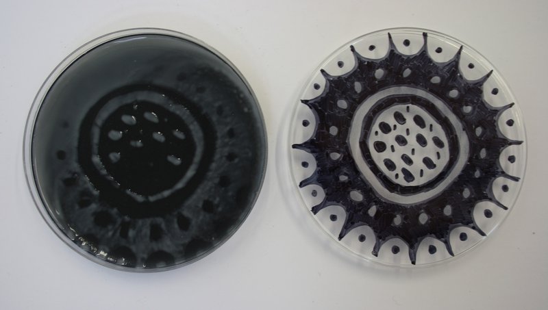 Agar was made from potatoes, coloured with activated charcoal or food colouring, and spread with live yeast – all from the local health-food shop. Some people chose to draw images directly onto petri dishes with pen or paint, and others cut foil templates. The yeasty petri dishes were then put under a high-powered UV LEDs overnight to selectively kill the yeast where there was no pen/paint or foil to block out the light. A patient 24 hours later, and the beautiful yeastograms were ready.