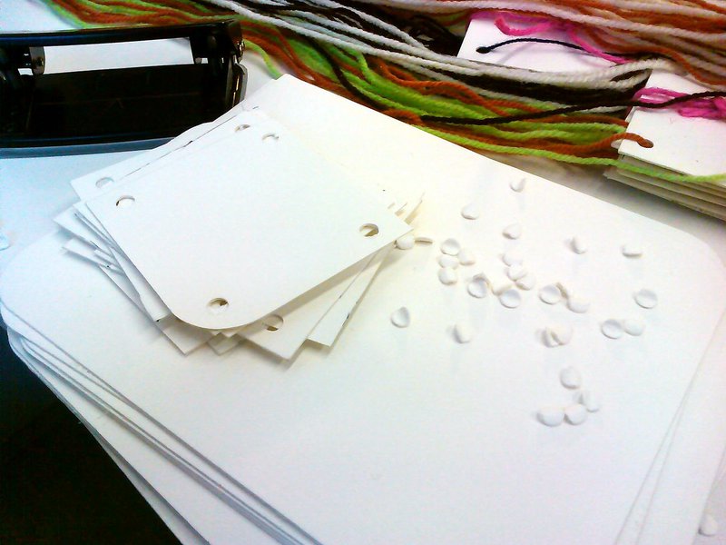The first thing you need to do is make the tablets themselves from fairly stiff card. You need squares of about 5cm, and holes punched out from the corners. Beer mats or playing cards are good, I'm just using recycled card here. It saves a bit of time later if you can get the holes lined up when the tablets are stacked together - but I've never managed to do this very well. A good number of cards to start with are 8 or 10, fewer in number are easier to manipulate and use less yarn - if you don't have much to spare.