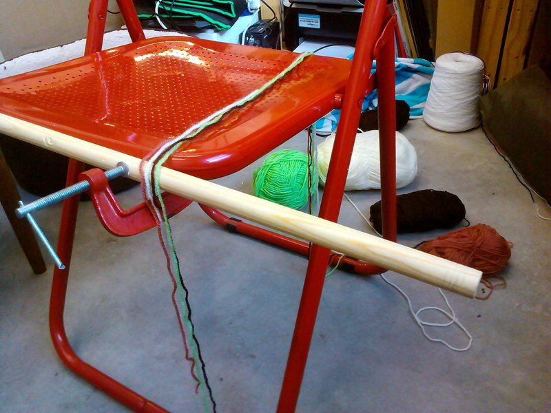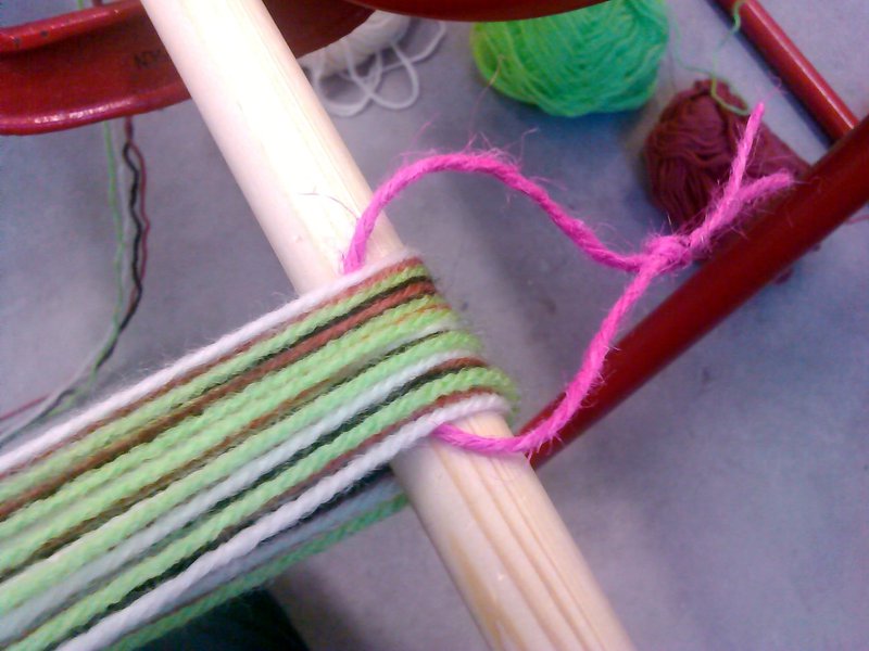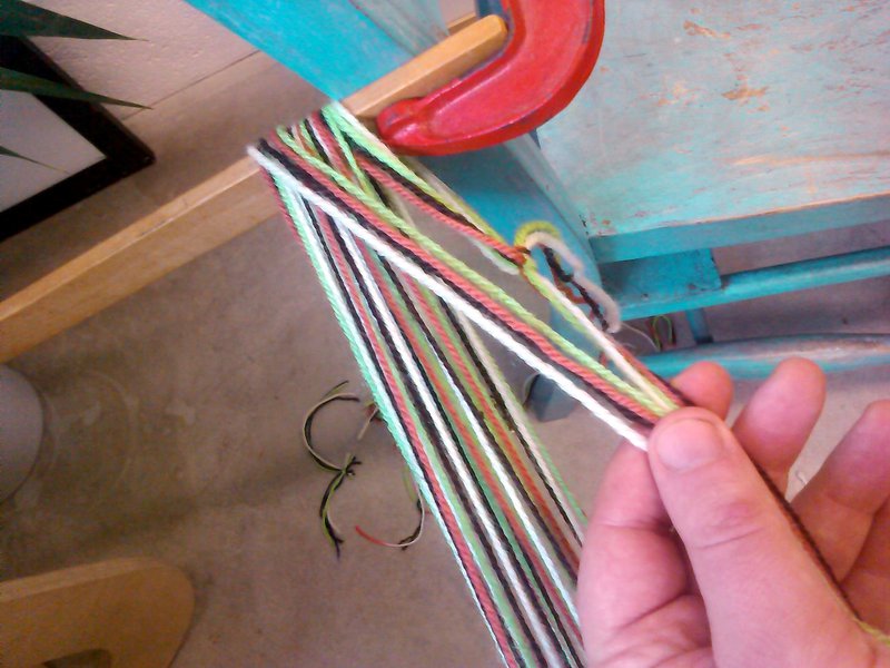 Now we tie the threads together looped over the warp stick furthest from the yarn, this knot is temporary.