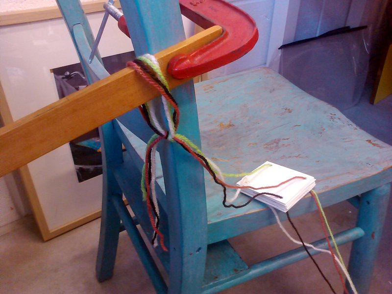 The second step is to prepare the warp yarn. You need four separate balls or cones of wool - it's easiest to start with four different colours, although you can make more patterns with double faced weave (two colours opposite each other on the cards). Fluffy knitting wool works fine but can catch and be annoying sometimes, cotton is better. In order to help prevent the yarn getting tangled together which is probably the biggest problem with this job - it's a good idea to set this up so the yarn passes through the back of a chair with the yarn on the floor like this - it restricts the distance the balls roll as you pull the yarn.