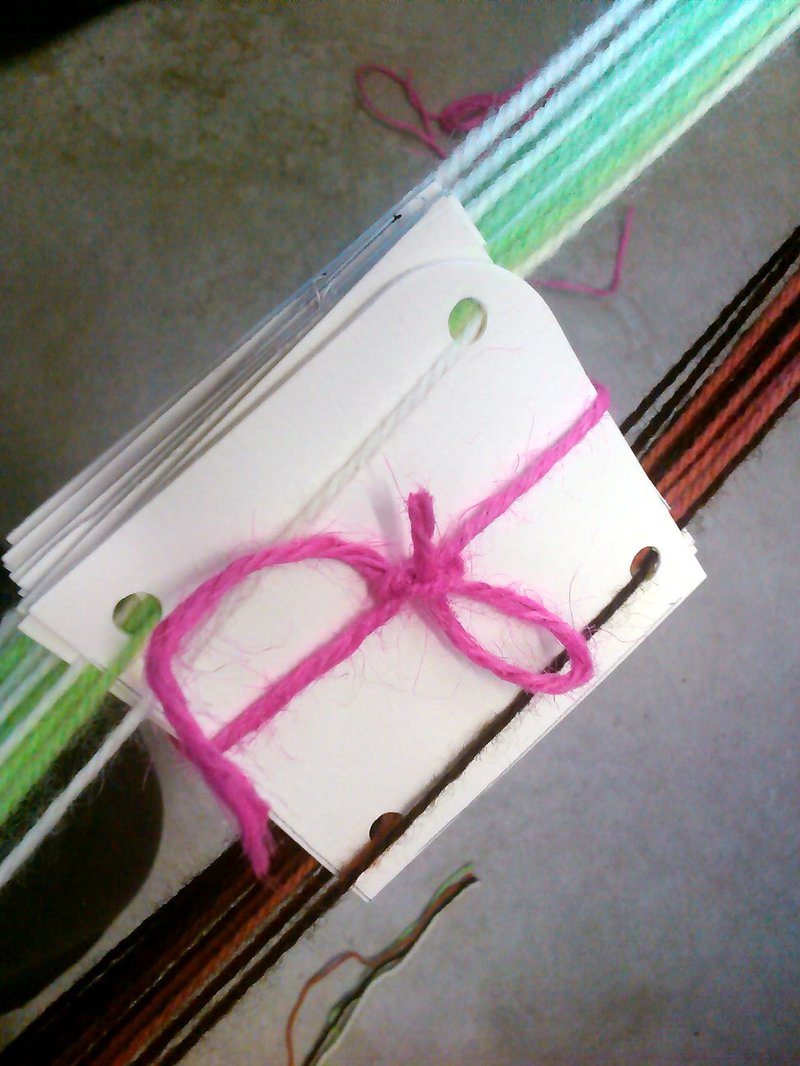 When you have done all of the tablets, quickly check that every warp pass has a card associated with it and then cut the first knot and tie the last warp threads to the first.