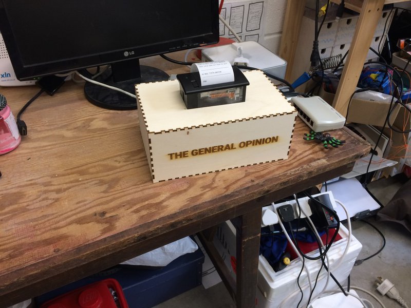The receipts. A thermal receipt printer was hooked up to a Raspberry Pi, pinging the TGO server every second or so for new responses. The newest response was printed - the user could either take their receipt with them, or add it to the wall of thoughts. The printer itself was presented in a custom laser cut box.