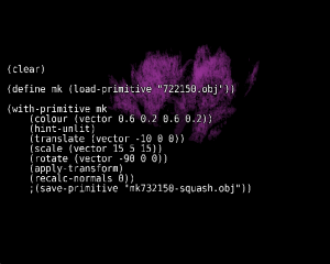 This was then converted to a poly primitive (via blobby, ~ofc~, much to Amber’s amusement) and saved as an OBJ file… this can be imported in the future, to save rendering times. The example below took half an hour to render – the joy of waiting! I don’t think that would suit the temporal and time sensitive nature of live coding, at all.