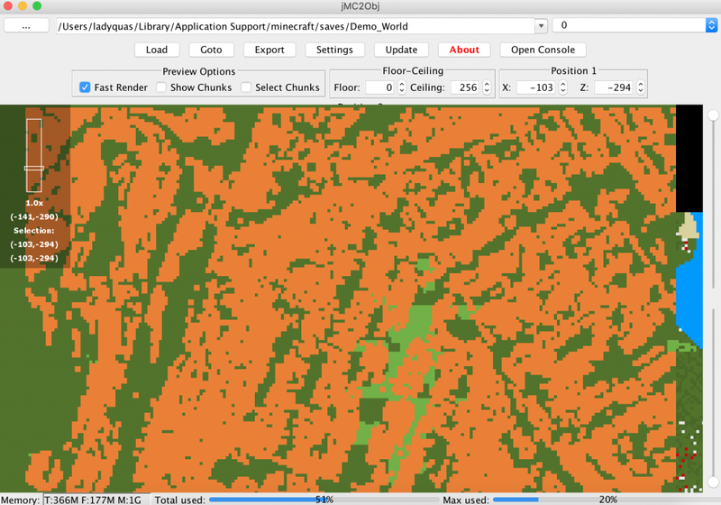 Using mcedit, I specified the PC version world folder, and selected the 255×255 area to export as a schematic, then imported it into my full-version demo world within mcedit, and saved. Booting up jMc2Obj, I selected the area to finally export as an .OBJ, and when faced with dozens of options, checked them all.