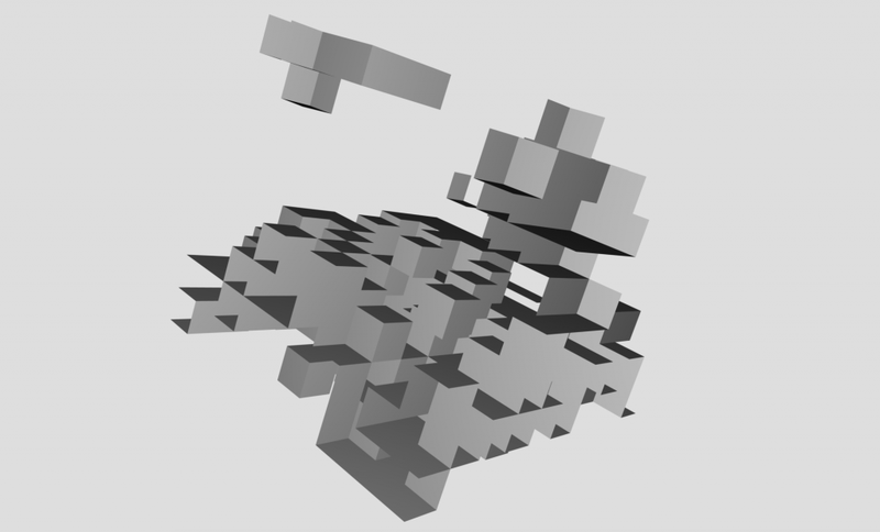 Looks pretty cool, but I expected space between blocks, as this area was characterised with areas of no density. More pootling was required, and with the removal of outer boundaries, my final .OBJ export resembled the below. I have rotated the object slightly to highlight blocks without faces. At first, this seemed only to occur on the extremities, but further investigation showed that this was also the case throughout the object.