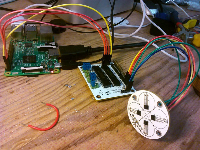 The picture below shows the first test boards populated and plugged it into the Pi - it's much neater than the lego and breadboard prototype! The good news is that it seems to work so far, the only problem I've had is with the hall effect sensors, the pads are a tiny bit too close together for my skills. After a couple of tricky situations fixed with a de-soldering pump, I think I've come up with a strategy that works. I can bend the outer pins away from each other and solder the central pin first - then bend them back to finish the outer ones and being very careful not to bridge the pads.