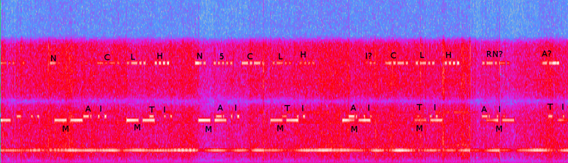 The second one is still unknown, but there are a few clues. It's a periodic burst of high speed data transmitted on a frequency band (6765 to 7000 kHz) that includes 'FAX' modes. It's likely that this is some kind of weather map - but it doesn't sound quite like any of the examples I've heard. The third recording is a collection of simultaneous morse transmissions on similar frequencies. They all seem to be machine generated, a lot of repetition - probably some kind of beacons. I've tried to decipher them below but no hidden messages unfortunately!