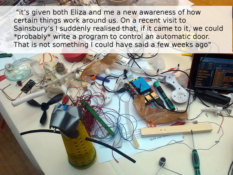The starting point for our Tanglebots workshop for example, is an e-waste scrapheap we search through for things to take apart and reuse. Sustainability issues like this are often better presented implicitly, to set the scene - which then leads to a more interesting situation than starting with identical 'kits'. You get to explore internal parts of cheap toys like dissecting natural organisms, and this process fits well with the haphazard reality of building technology, and working with family groups leads to knowledge sharing of the kind that would be needed to keep skills alive after collapse.