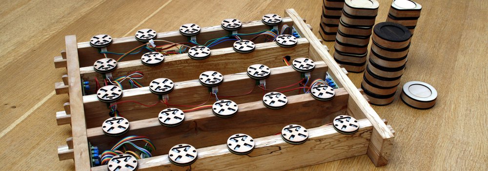In order to alleviate this we use probabilistic filtering to reject these brief edge cases. We can say that the probability of a rotation (“N,S,S,S” -> “S,N,S,S”) or a flip (“N,S,S,S” -> “S,N,N,N”) is more likely to occur than a new token appearing (“N,N,S,S” or “S,S,S,S”) so we can delay the registering of the second case and wait to see if a rotation or flip of the current token is read within a fixed time span. The driver does this by storing a ‘theory’ and a ‘current’ value for each sensor location, and checking new observations against these – and only overwriting the current value with the theory after it is confident enough based on timing, that in fact a new token has been placed on the sensor.