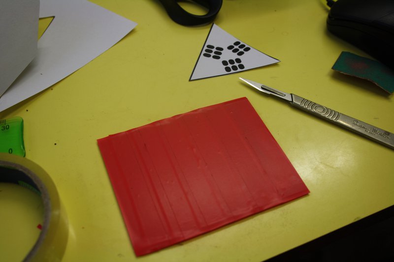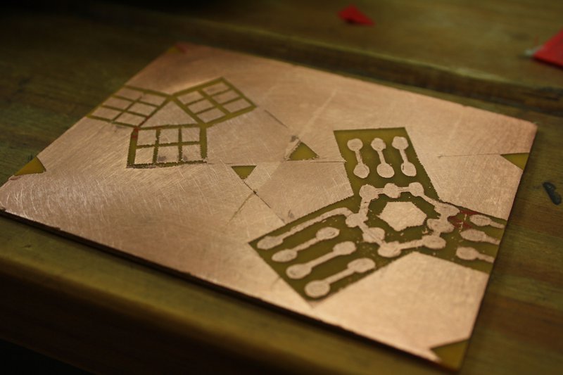 We stuck the template to the board and used it to guide cuts that go all the way through the tape to expose the copper.