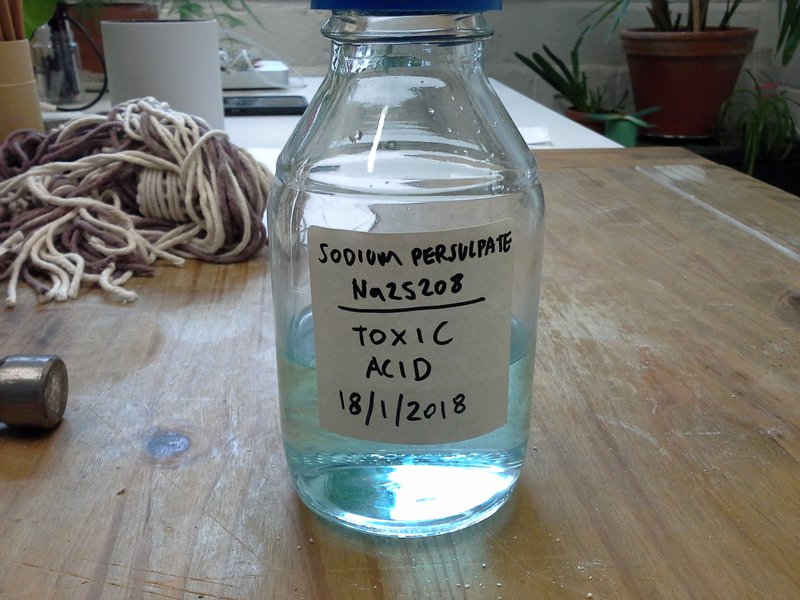 Afterwards we store the acid as it can be used again, the blueness indicates the amount of dissolved copper - when this gets too dark it stops working, then you can neutralise the acid by adding bicarbonate of soda and take it to the tip for safe disposal. Obviously the labelling is important - not just the fact it's toxic but the date it was made, for future use - it should last a few months.