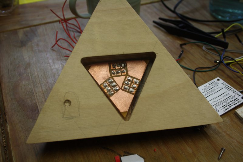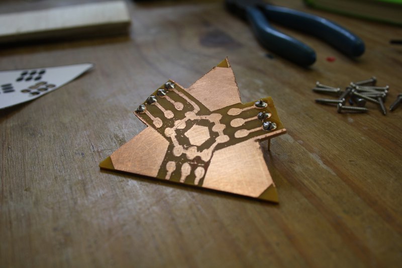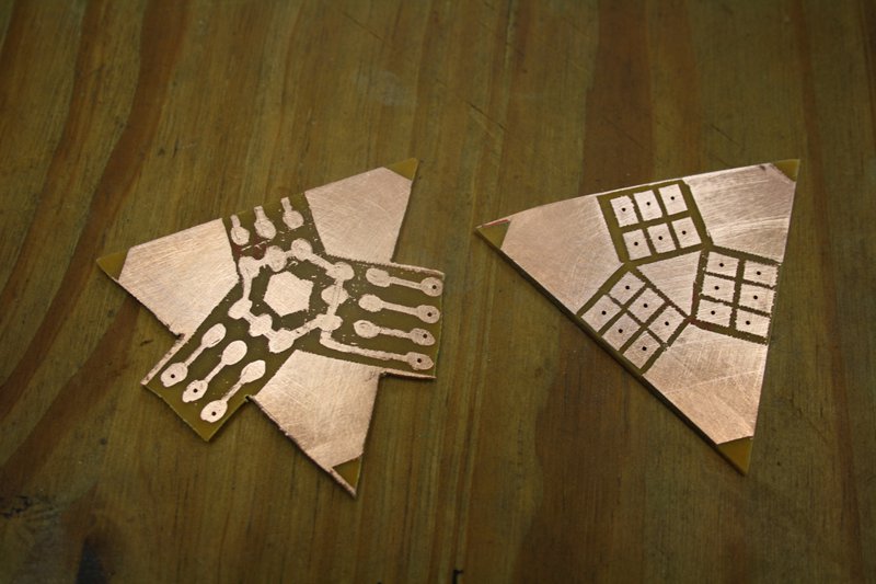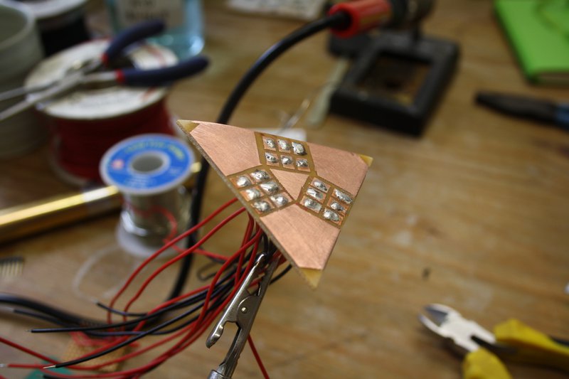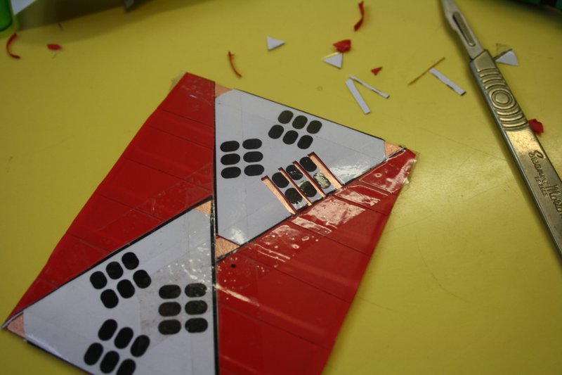 First we design a outline and print it out at the correct scale, you can see this in the background in the photo below. As we are using triangular plugs/sockets, we need to be able to 'read' the receptor in any orientation, so 18 pads are needed in total.