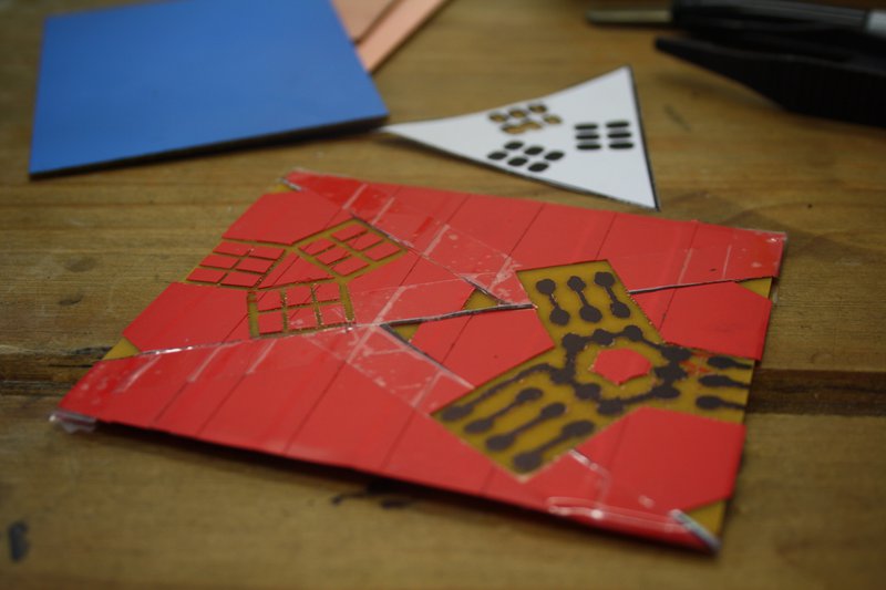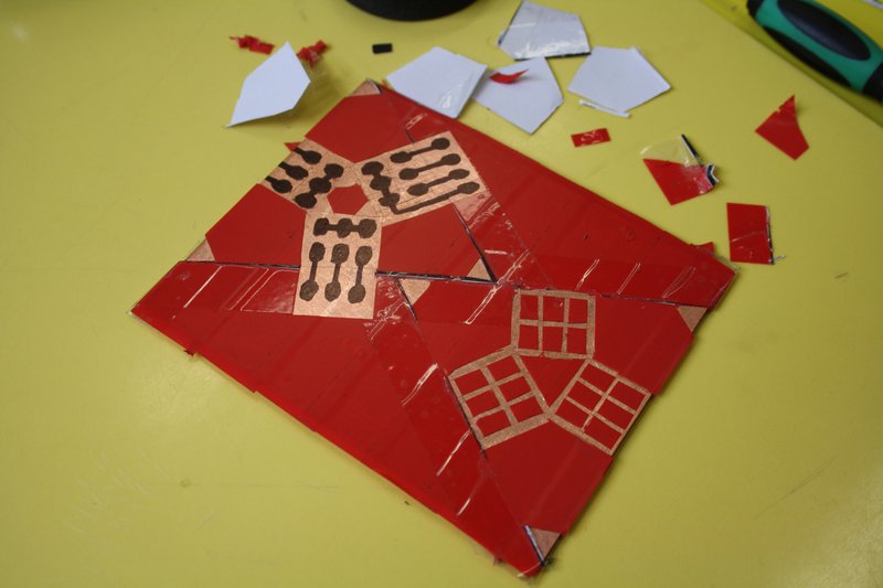 We are trying two different methods and designs here - one using just the tape cut-out where we create 18 separated islands which we can drill though and solder to create raised touchpads, and another drawing a more complex circuit with a sharpie felt tip pen. The second approach provides a flat connection area, as no soldering is needed on the touch pads themselves - but we can still solder connections on the edges of the board (this becomes a bit clearer later).