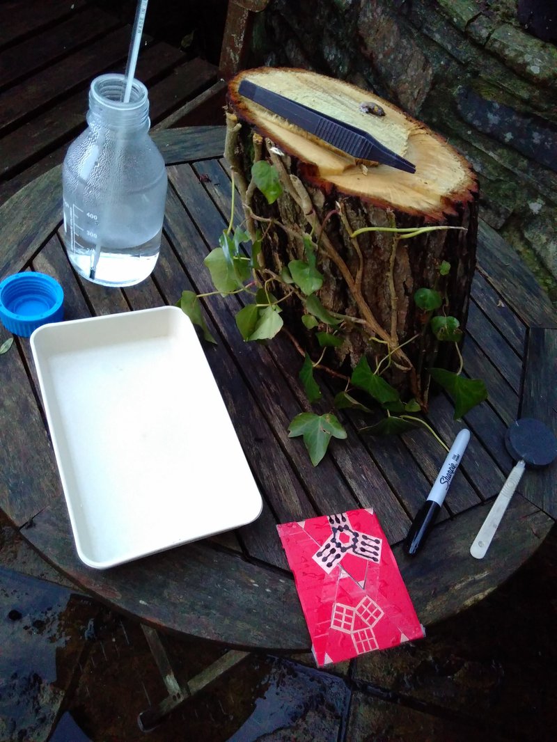 The general concept is that copper clad boards are etched with acid in patterns that control the flow of electricity when components are soldered to them. We will be using some (quite old) sodium persulfate crystals here, added to water to form an acid bath for the board, which will be immersed until the exposed areas of copper are dissolved. We wanted to try two approaches to creating a 'resist' that would prevent the etching, one using insulation tape (actually horse leg bandage tape - well, we are based in a rural setting!) - the other simply using permanent marker to draw the circuit.