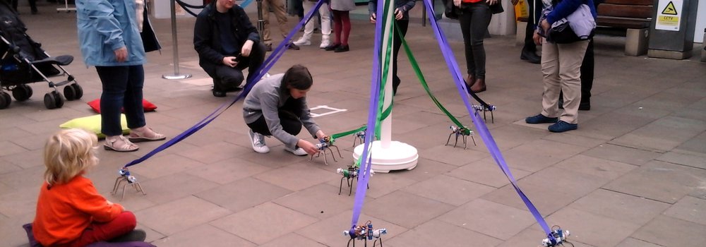 They were set up in a simple choreography, with two groups of 4 robots taking it in turns to rotate in opposite directions around the maypole to create an overlapping twist pattern. This was orchestrated by a Raspberry Pi with each robot reporting back it's telemetry using radio messages. We tried different walk speeds depending what else was going on, but they took approximately half an hour to create a full braid and another half hour to undo it.