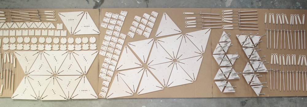 The final virus capsid assembly is designed to be modular with each triangle easily replaceable - we made spares to add in redundancy. It also results in a structure that is surprisingly light and strong. The 3D printed corner connectors were originally used for another design by Aaron Moore, lamp shades inspired by one of the first Viruscraft workshops, so it was really satisfying to put them to use here.