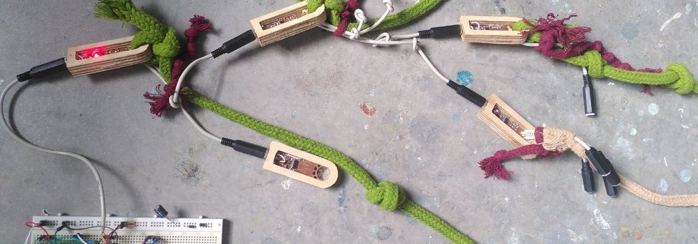 For the moment we have a handful of 'pendants' which are knotted cords tied to a 3.5mm plug and with a series of sockets. Each pendant can connect to a number of "child" pendants below it, and plugged into its own parent pendant. The plugs are a weak imitation of the knot tying processes used to construct a khipu, but are also a nod towards electronic music/analogue computers and their patch cords. Each pendant also has it's own haptic feedback in the form of a tiny vibration motor. The top of the tree is a microcontroller board that can read the resulting structure, and currently represents it as a diagram on an LED display.