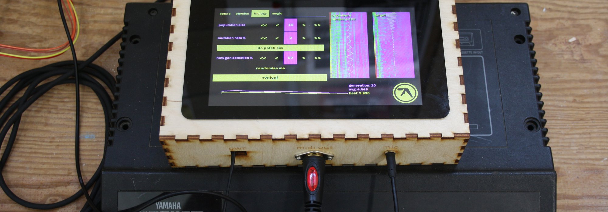 Made in collaboration with Aphex Twin, the midimutant learns how to program your DX7 synth so you don't have to. Equipped only with a microphone input and midi output, the midimutant runs on a Raspberry Pi and uses artificial evolution to grow new sounds on hardware synthesisers that mimic an example sound you provide.