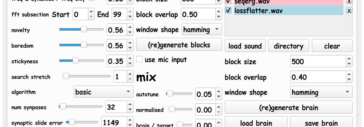 Samplebrain chops samples up into a 'brain' of interconnected small sections called blocks which are connected into a network by similarity. It processes a target sample, chopping it up into blocks in the same way, and tries to match each block with one in it's brain to play in realtime.